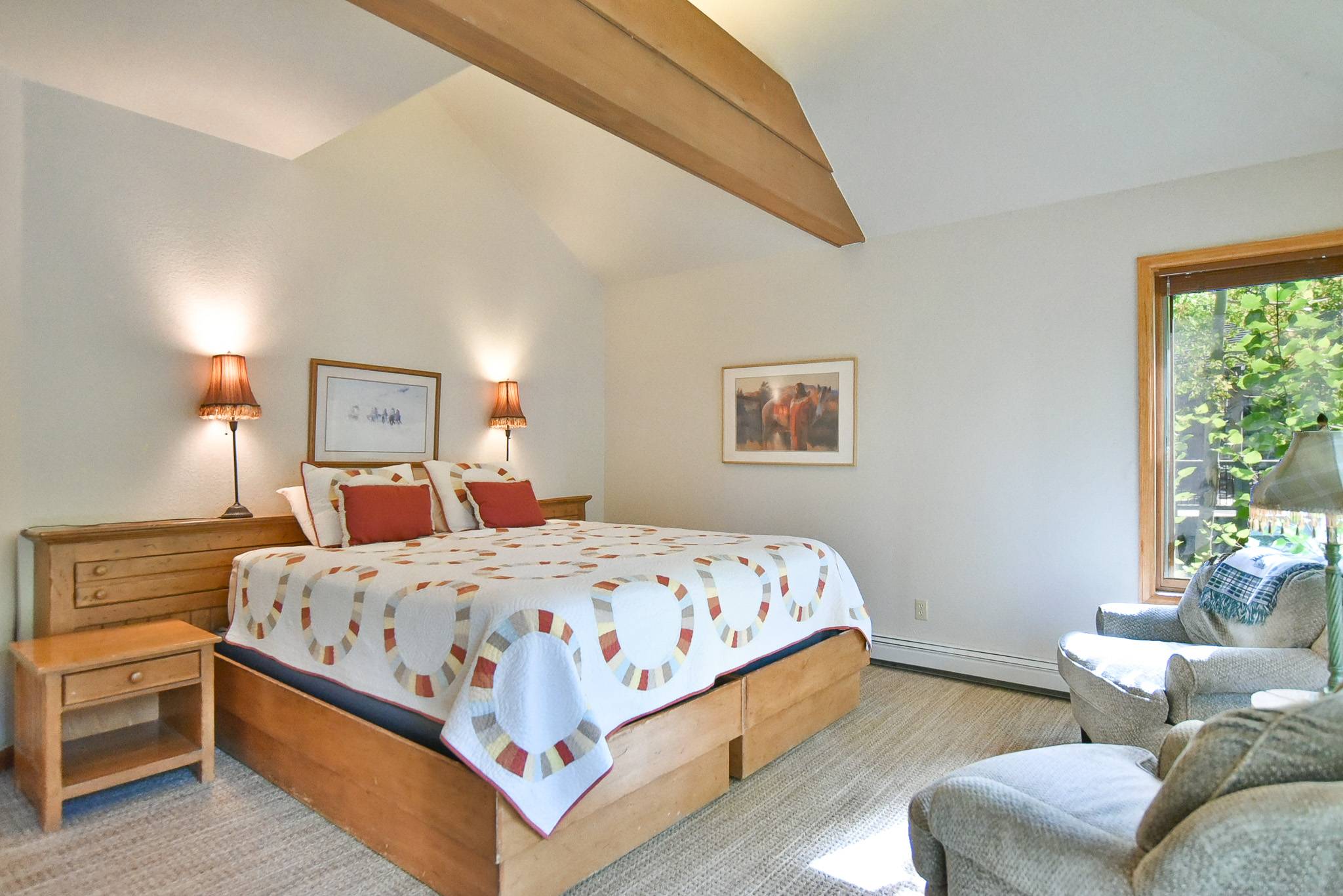 - Suite 2, Sundown Suite: king bed (default setup; can be two extra-long twins upon request), private bath with tub/shower, vaulted ceiling, superb views of ski area. (sleeps 2)