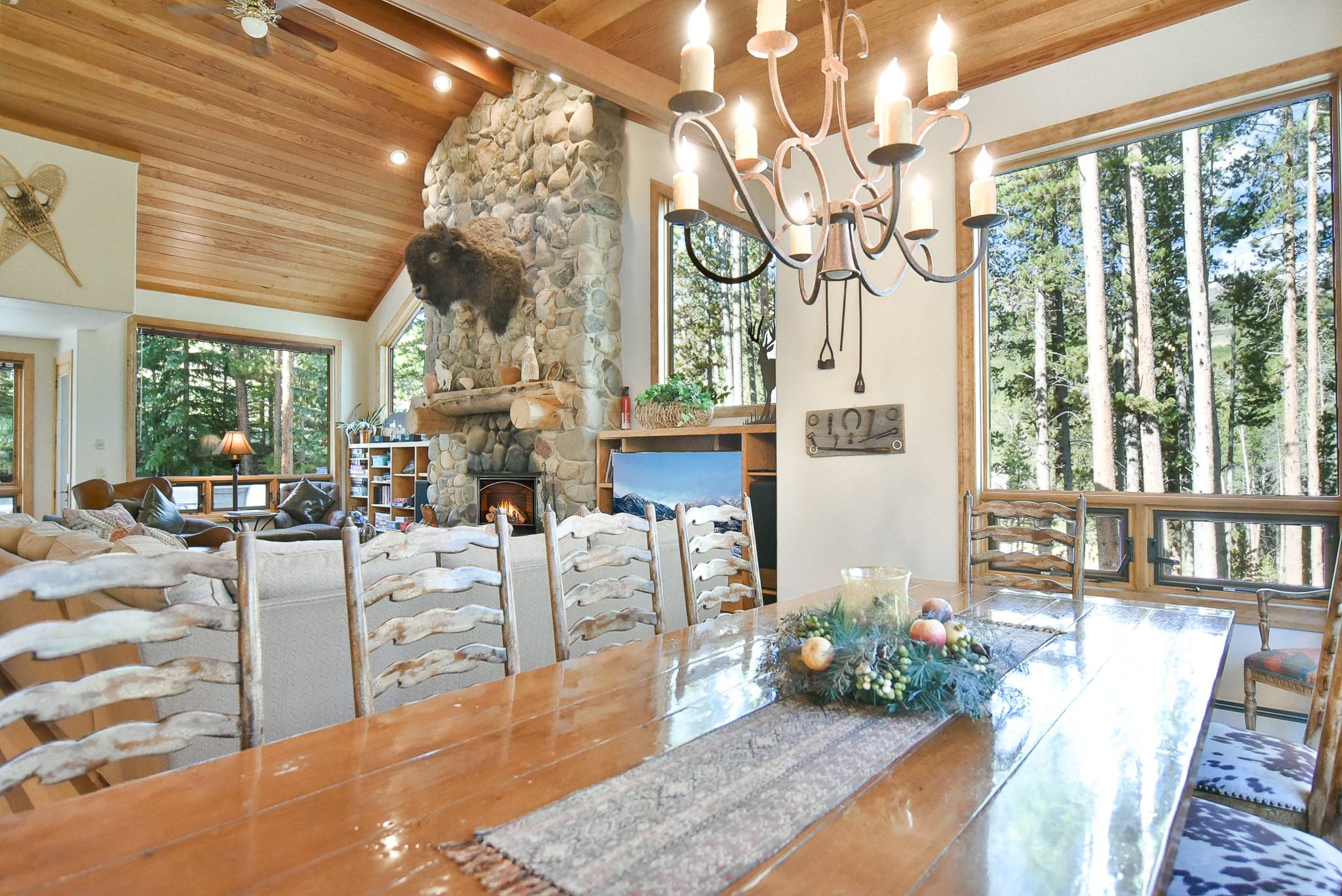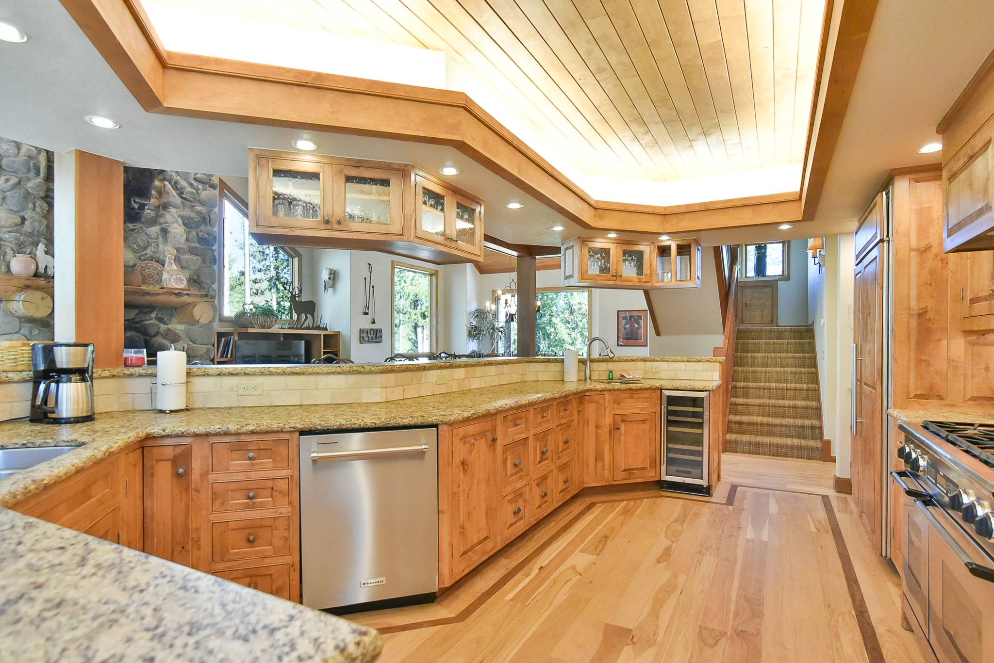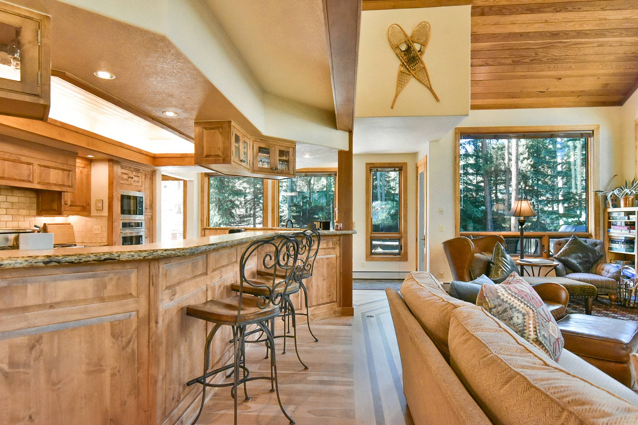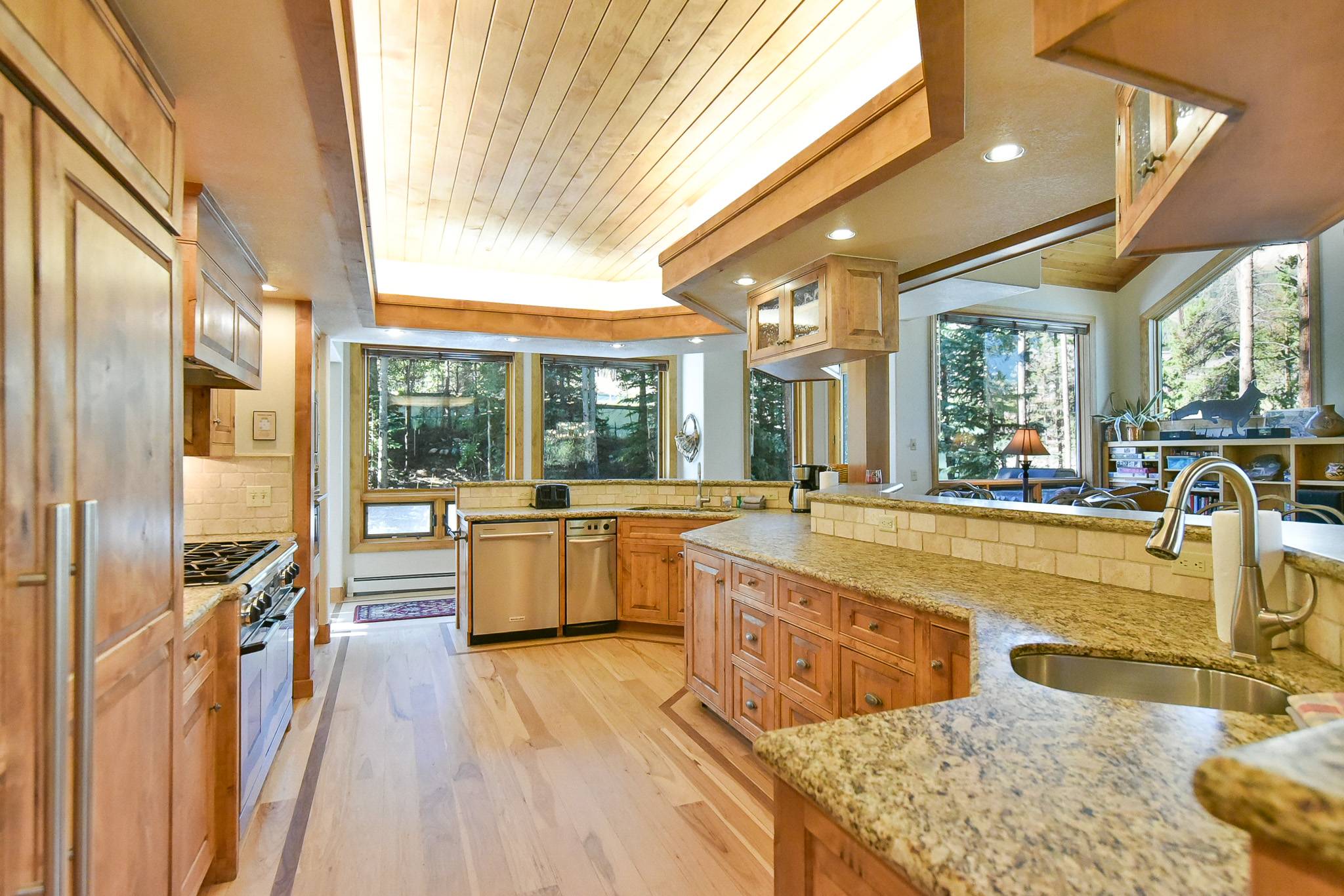 As you can see, the living area is magnificent! There’s a large flat-screen TV and home theater system; downstairs, there’s a recreation room with another flat-screen TV and home theater system, a pool table, wet bar, refrigerator and microwave. And how about that kitchen: granite counters, a 48” Décor range with 2 ovens, a stacked Thermador microwave/warming drawer/convection oven, a Sub-Zero refrigerator, 2 KitchenAid dishwashers … it’s a dream for weekend chefs as well as professional caterers. The lovely alder table that seats 12, with room for four more at the counter. And you’ll love the cozy breakfast nook with fantastic views of the ski slopes and seating for eight.