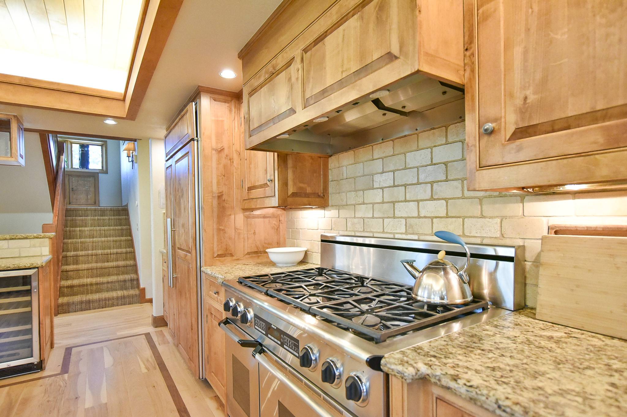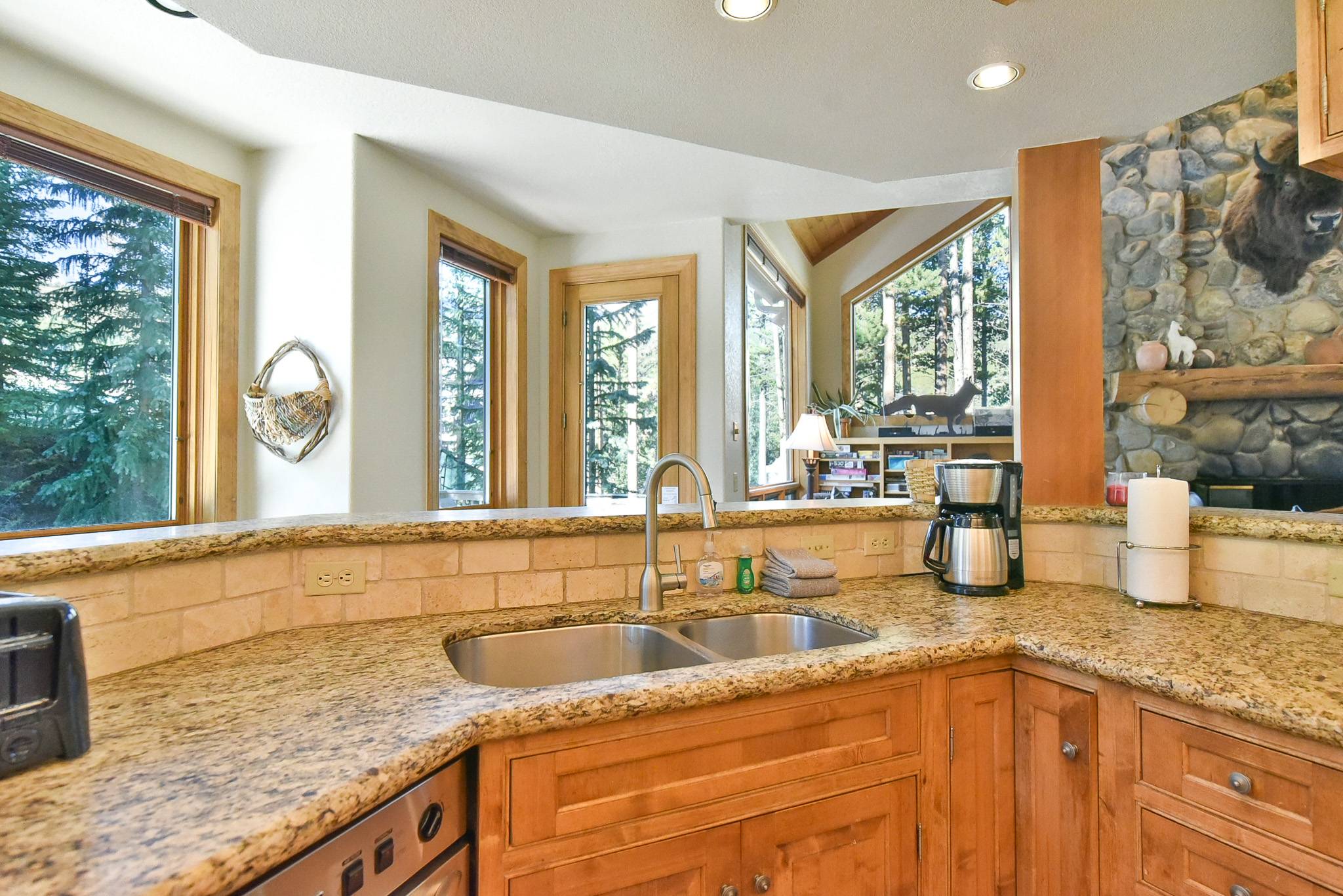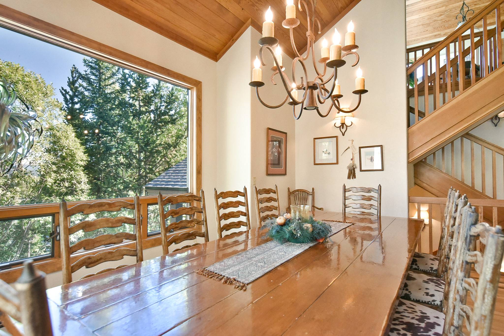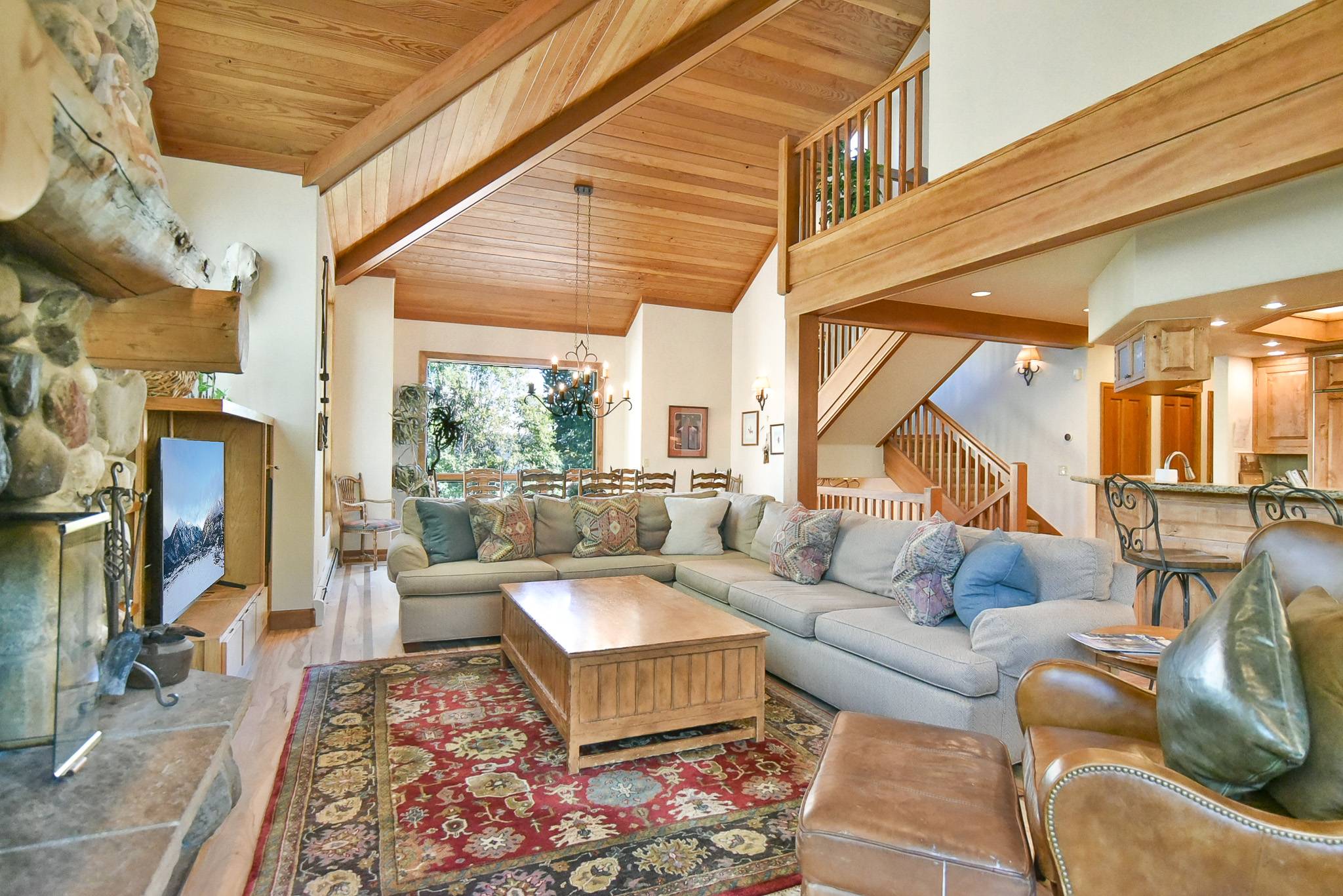 As you can see, the living area is magnificent! There’s a large flat-screen TV and home theater system; downstairs, there’s a recreation room with another flat-screen TV and home theater system, a pool table, wet bar, refrigerator and microwave. And how about that kitchen: granite counters, a 48” Décor range with 2 ovens, a stacked Thermador microwave/warming drawer/convection oven, a Sub-Zero refrigerator, 2 KitchenAid dishwashers … it’s a dream for weekend chefs as well as professional caterers. The lovely alder table that seats 12, with room for four more at the counter. And you’ll love the cozy breakfast nook with fantastic views of the ski slopes and seating for eight.