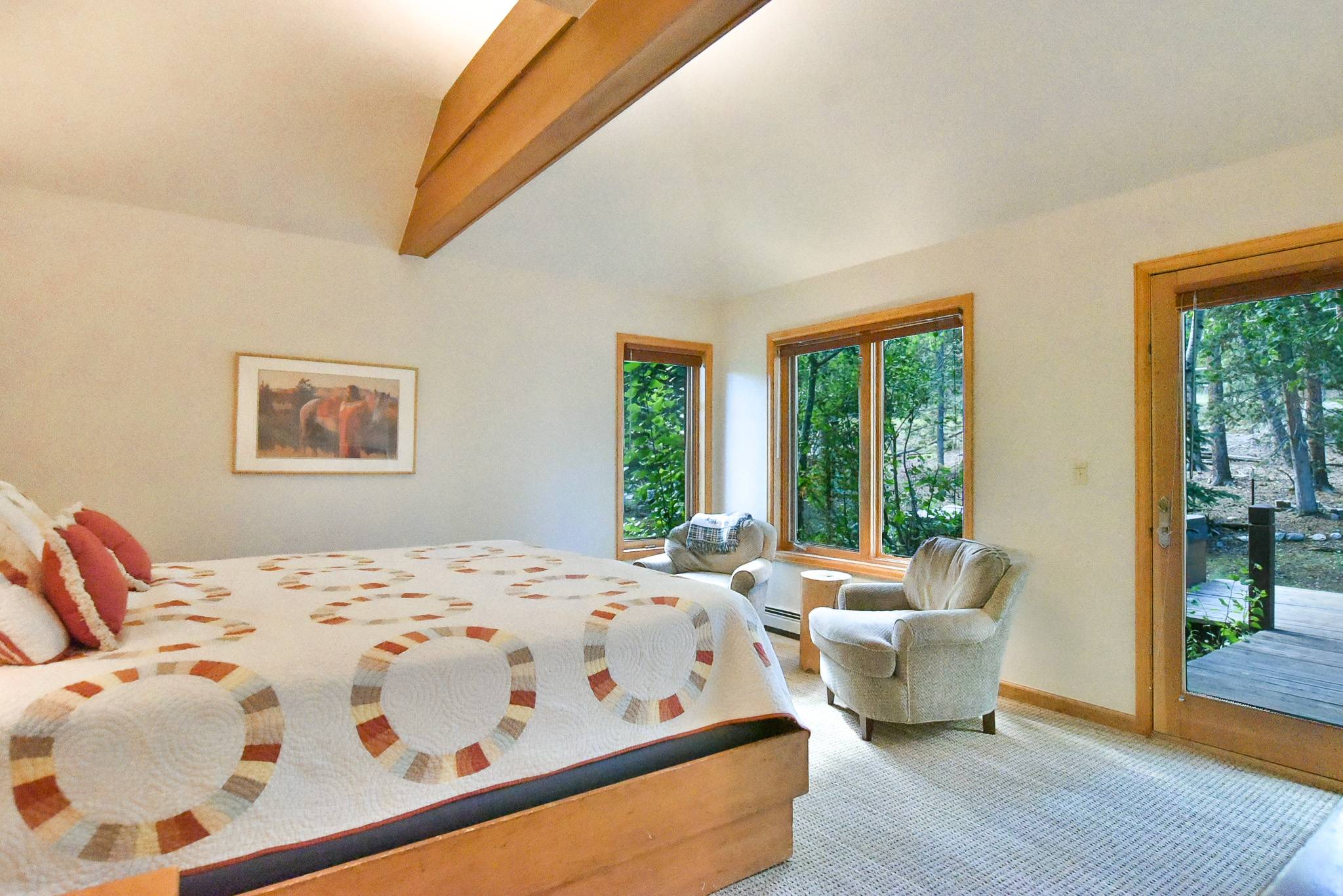 - Suite 3, Four O’Clock Suite: king bed (default setup; can be two extra-long twins upon request), private bath with steam shower, vaulted ceiling, flat-screen TV, private door to deck and hot tub, ski area views. (sleeps 2)