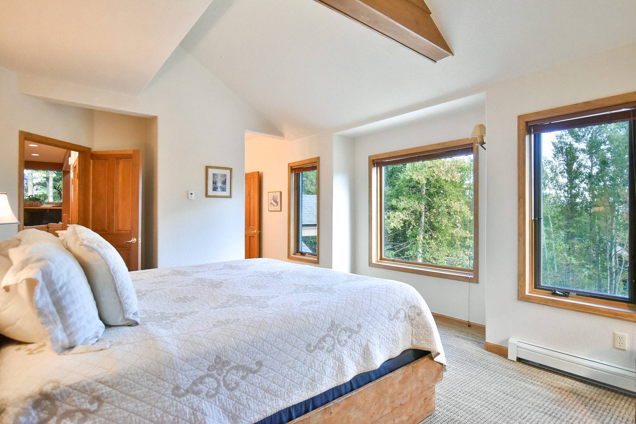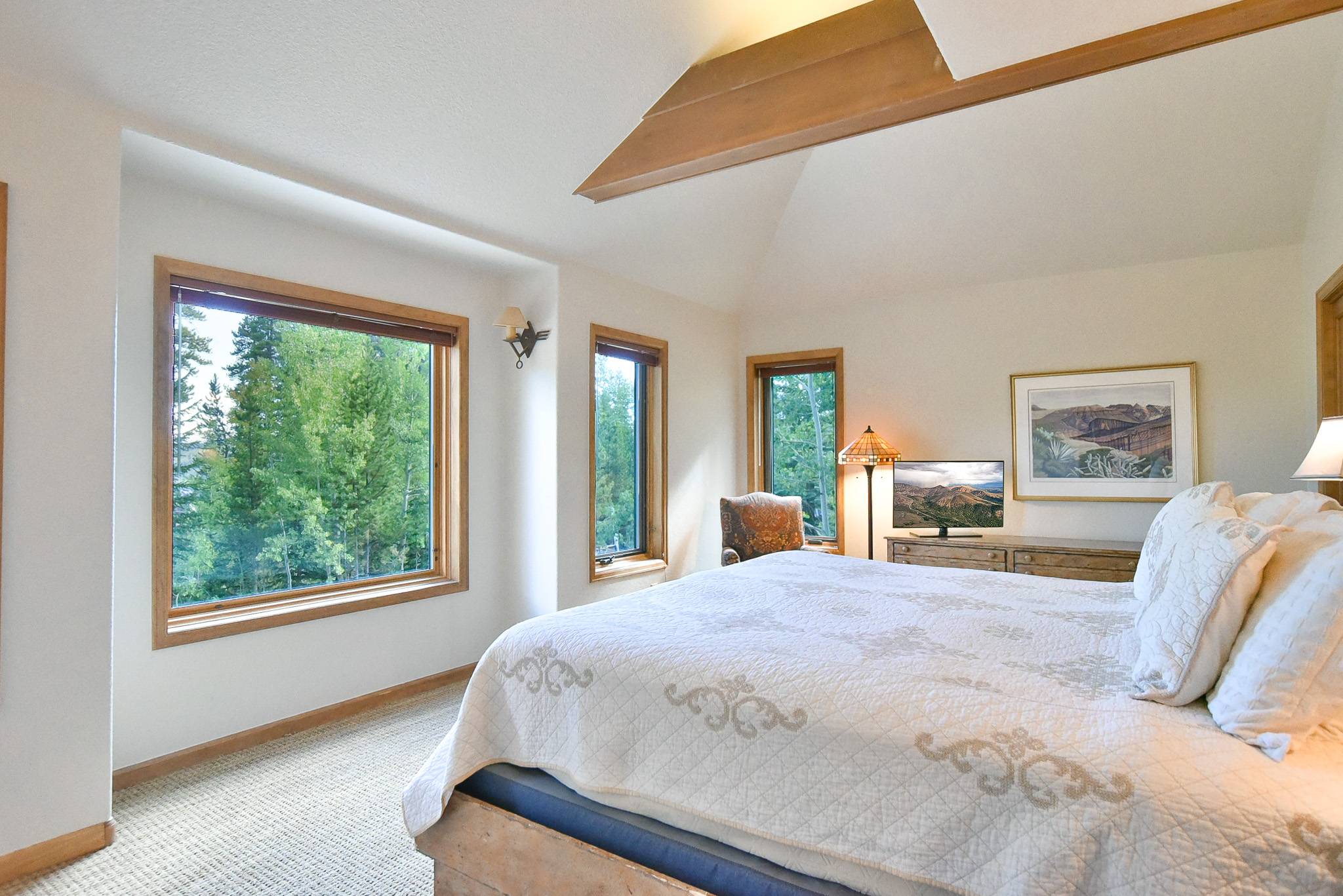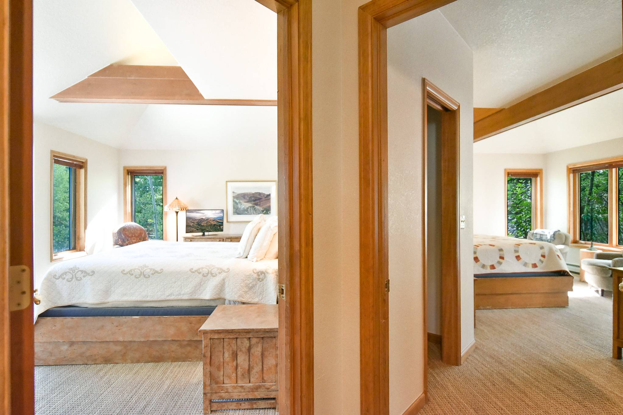 - Suite 1, Imperial Suite: king bed (default setup; can be two extra-long twins upon request), twin trundle bed (pulls out to two twin beds), private bath with steam shower, vaulted ceiling, flat-screen TV, superb views of ski area. (sleeps 4)