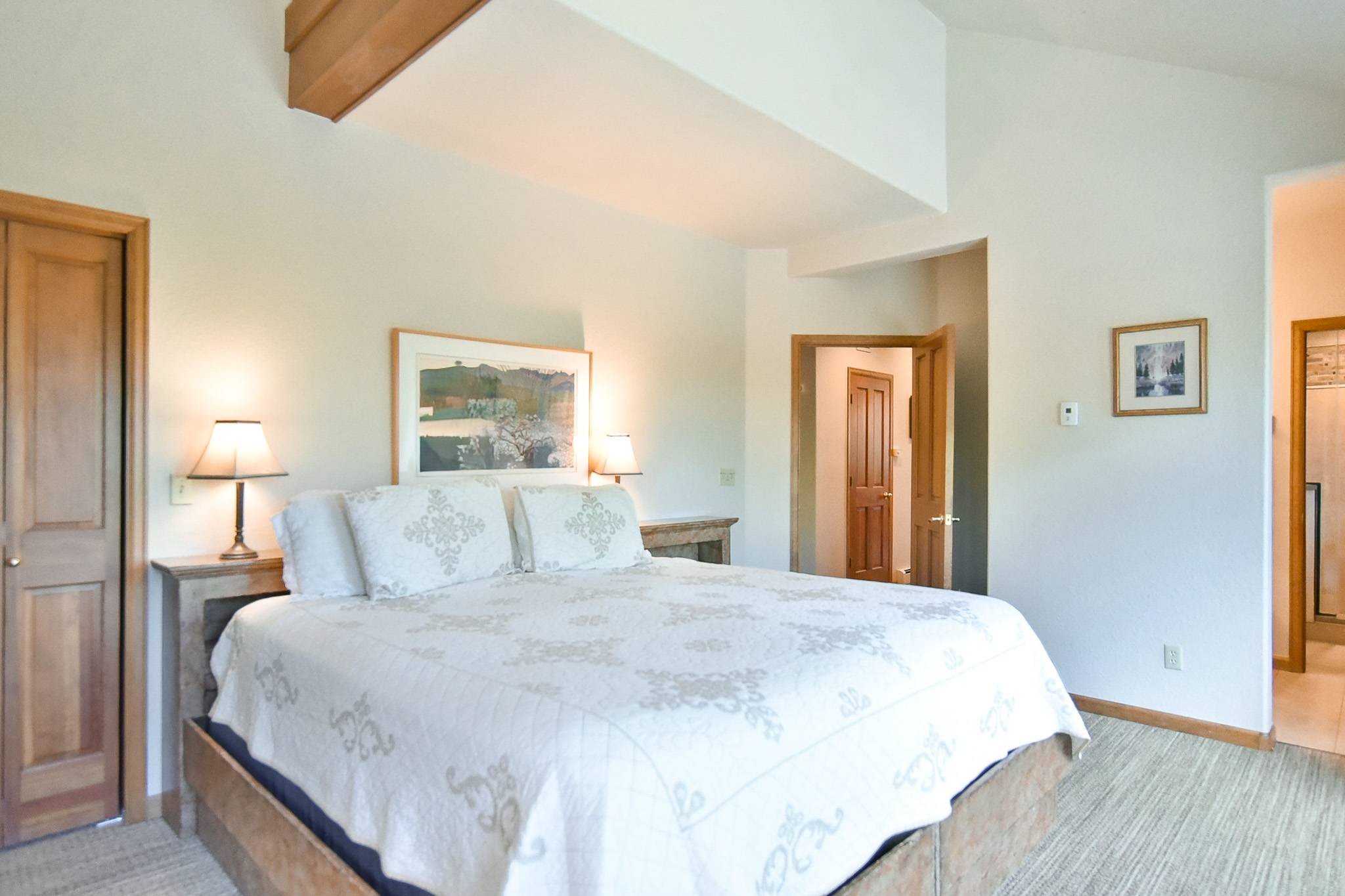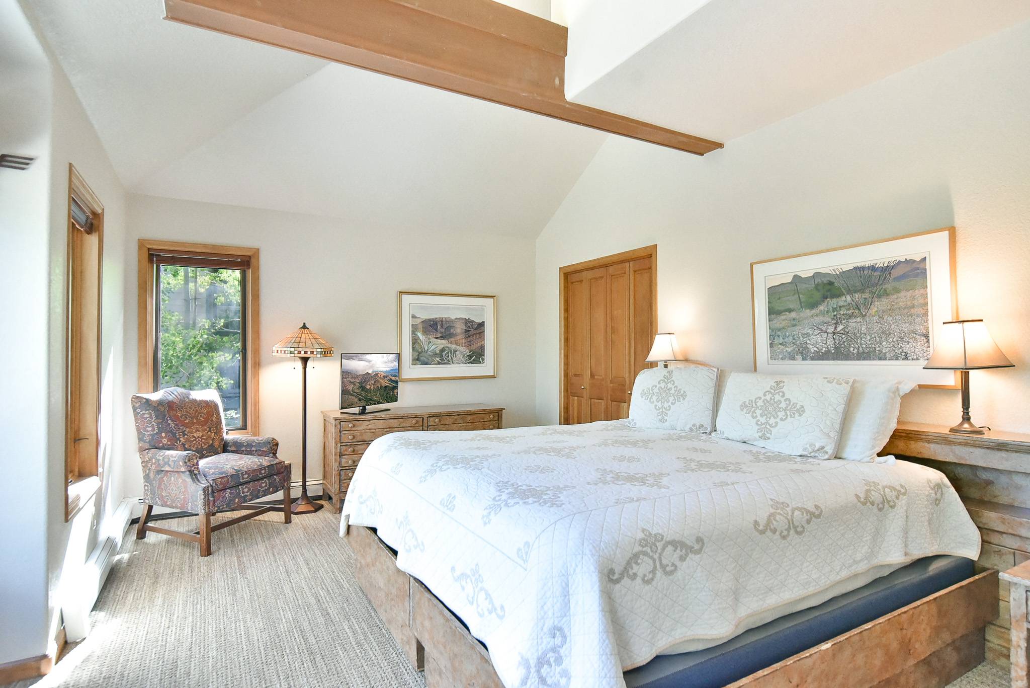 - Bedroom 5, Claimjumper Suite: king bed (default setup; can be two extra-long twins upon request), TV, ski area views. (sleeps 2)