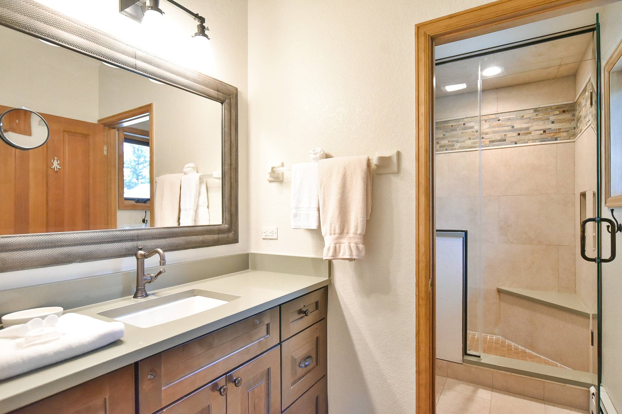 There’s a large private hot tub on the deck, as well as a gas grill. Other amenities include a washer and dryer, a large, two-car garage with extra parking in the heated driveway, and complimentary Wi-Fi. As in all SMR properties, supply all linens, basic toiletries, and the home is professionally cleaned and inspected before every arrival. And our professional staff is available 24/7 to help make your stay as enjoyable and worry-free as possible.